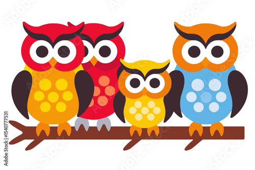 © qtann, Fototapeta premium Cute Colorful Owls On A Branch- Whimsical Bird Illustration- Cartoon Owl Family- Adorable Owl Art- Nature Inspired Graphics- Childrens Decor- Kids Room Art