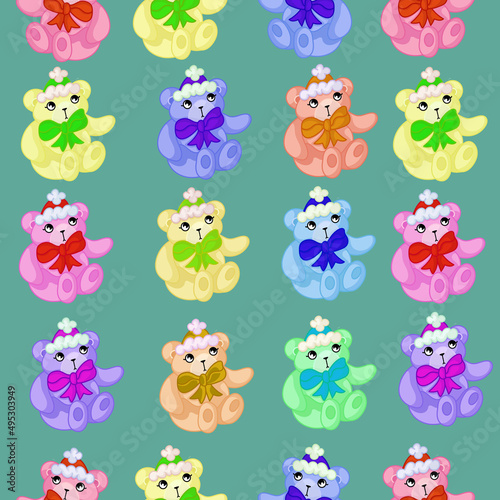 © Zhamilya, Fototapeta premium Cute colorful teddy bears seamless pattern. Cozy vector hand drawn texture. Festive background for web pages, invitations, postcards and save the date cards. Vector illustration.
