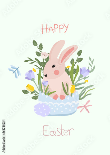 Fototapeta premium Cute composition with a rabbit sitting in a basket, spring flowers, butterflies and Easter eggs. Spring flowering. Vector graphics