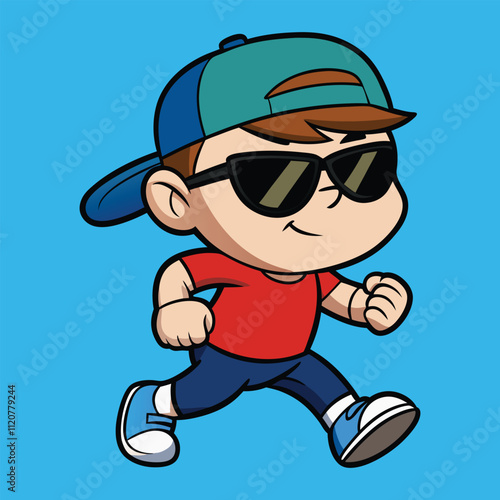 © Mixed graphics, Obraz premium Cute Cool Boy Wearing Sunglasses and Hat Doing Lunges - Cartoon Illustration