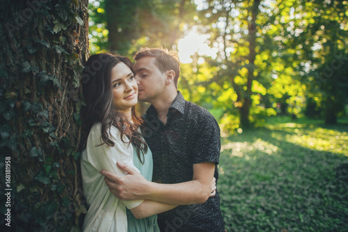Fototapeta premium Cute couple kissing in the park on a sunny day