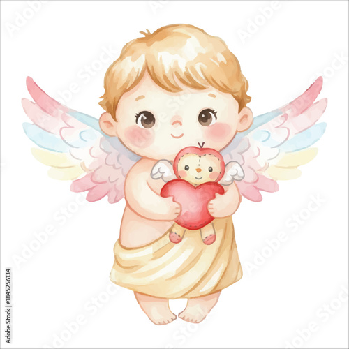 Fototapeta premium Cute Cupid Angel Holding Toy Watercolor Vector Illustration Isolated on White Background