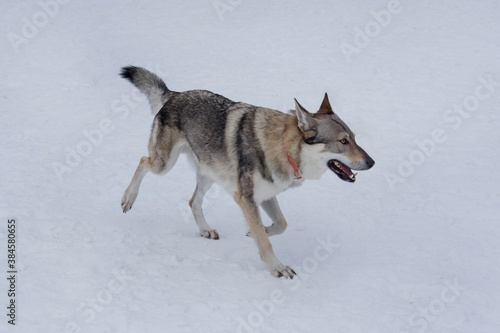 © tikhomirovsergey, Naklejka premium Cute czechoslovak wolfdog puppy is running on white snow in the winter park. Pet animals.