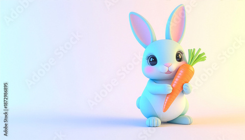 Obraz premium Cute 3D cartoon bunny holding a huge carrot on pastel background