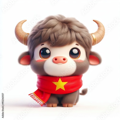 © JetHuynh, Naklejka premium cute 3d fluffy buffalo character with red Vietnamese style scarf