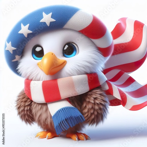 © JetHuynh, Fototapeta premium Cute 3d fluffy Eagle character with USA style scarf, white background