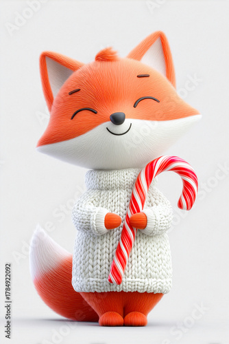 Naklejka premium Cute 3D fox in knitted sweater holding candy cane - cozy Christmas joy and...