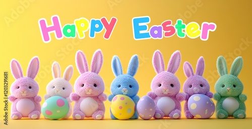 Obraz premium Cute 3d Plush Bunnies in a Row Yellow Background Colorful Eggs Happy Easter...