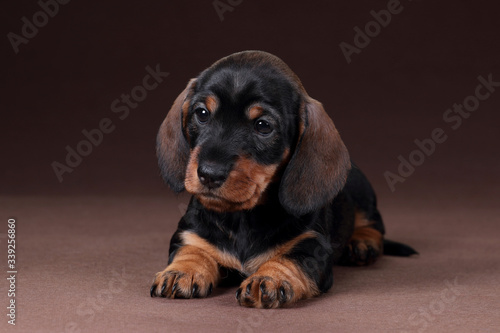 © adyafoto, Fototapeta premium Cute Dachshund puppy lying on a brown background