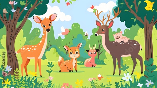 © Adobe Contributor, Naklejka premium Cute Deer Family In The Forest Illustration