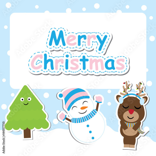 © Humairiah, Fototapeta premium Cute deer, snowman and Xmas tree vector cartoon for Xmas postcard, wallpaper, and greeting card, vector illustration