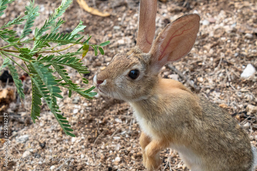 © Charles, Fototapeta premium Cute desert cottontail rabbit eating mesquite tree branches.