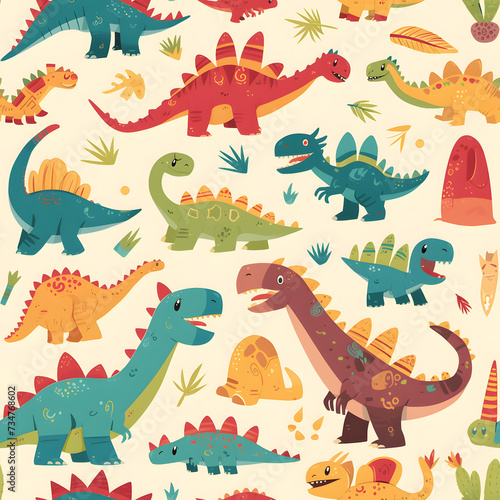 © Pacharee, Obraz premium Cute dinosaur cartoon seamless pattern on background.