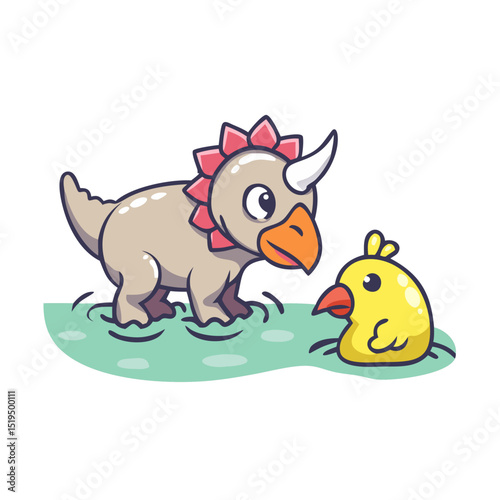 Obraz premium Cute dinosaur character interacts playfully with a small yellow bird in a...
