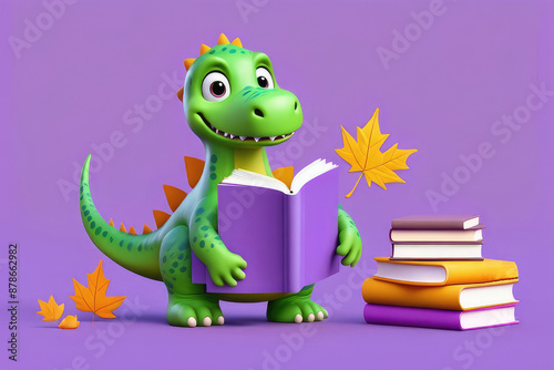 Naklejka premium Cute dinosaur reads a book on lilac background.