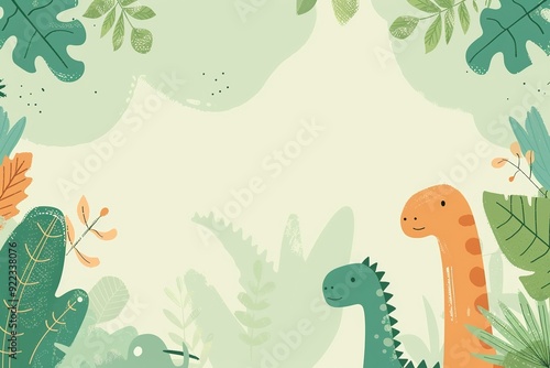 © Алена Ваторина, Obraz premium Cute dinosaur-themed background with playful cartoon dinosaurs and leafy plants