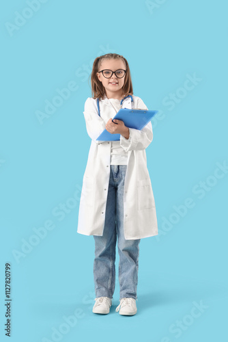 © Pixel-Shot, Fototapeta premium Cute doctor with clipboard on blue background