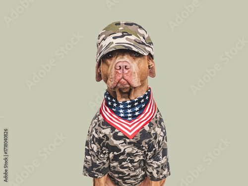 Fototapeta premium Cute dog, American Flag and military shirt. Closeup, indoors. Studio shot. Congratulations for family, loved ones, relatives, friends and colleagues. Pets care concept