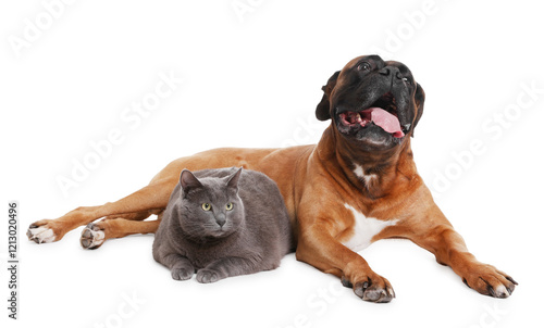 © New Africa, Obraz premium Cute dog and cat lying on white background