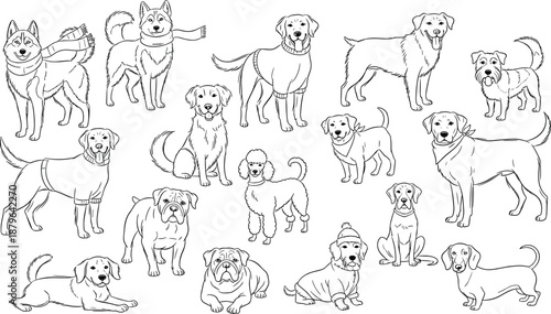 © HazelQueen, Fototapeta premium Cute Dog Breeds Collection Hand Drawn Line Art Sketch Vector Illustration Set