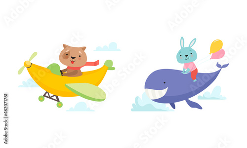 Obraz premium Cute Dog Flying in Banana Helicopter and Hare on Back of Whale Vector Set