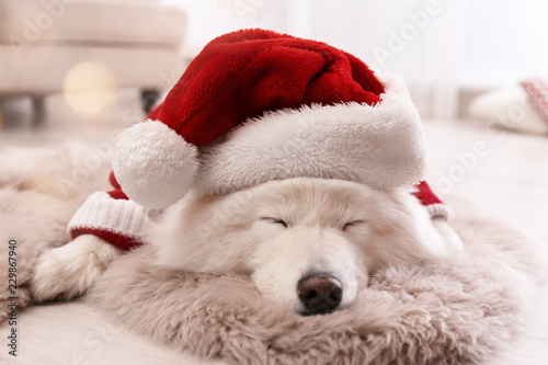 Fototapeta premium Cute dog in warm sweater and Christmas hat on floor at home