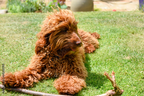 Fototapeta premium Cute dog playing with a stick in a garden on a sunny day