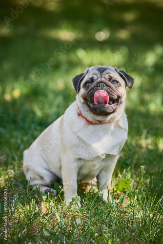 © Laima Gri, Obraz premium Cute dog sitting on green grass background.
