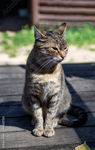 Naklejka premium Cute domestic cat sitting on doorstep outside house, portrait. Cat basking in the sun. Relaxed animals. Selective focus, shallow depth of field.