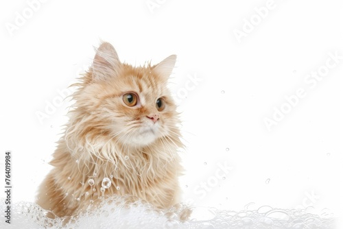 © Elenka, Fototapeta premium cute domestic cat with light beige fur washes itself wet from water on a white background isolated