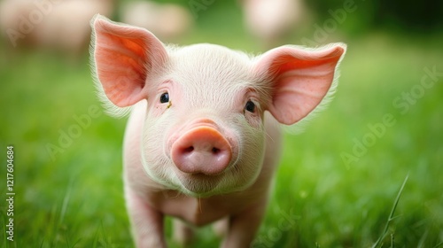 Fototapeta premium Cute domestic piglet standing on green grass in natural outdoor setting with blurred background and ample copy space.