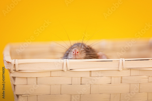 Obraz premium cute domestic rat looking up from basket on yellow background