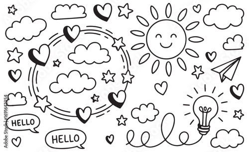 Fototapeta premium Cute Doodle Collection: Sun, Clouds, Hearts & More!