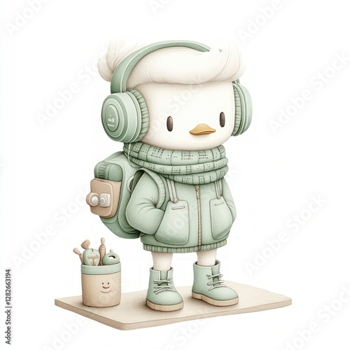 Naklejka premium Cute Duck Traveler Digital Art Pastel Headphones Backpack Boots...