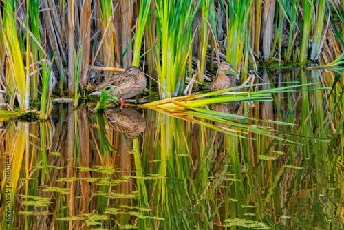 Obraz premium Cute ducks resting in a wetland in Alberta during the daytime