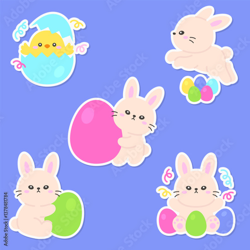 Fototapeta premium Cute Easter Bunnies with Colorful Eggs and a Hatching Chick on a Blue Background Vector Illustration