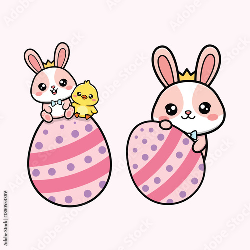 Fototapeta premium Cute Easter Bunny and Chick Sitting on Egg Kawaii Vector Illustration