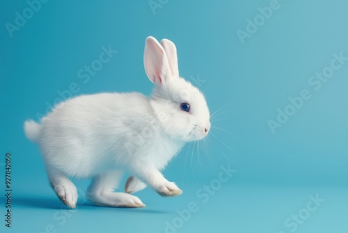 © Tetiana, Obraz premium Cute Easter bunny hops and sniffs on blue screen