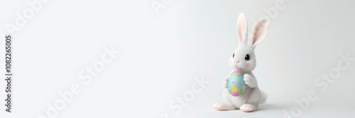 Obraz premium Cute Easter bunny rabbit holding decorated egg on neutral gray background,...