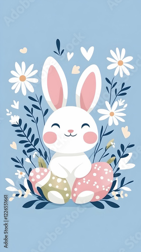 © Lailatul, Obraz premium Cute Easter bunny sitting on eggs amidst spring flowers; pastel background, ideal for cards