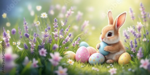 Fototapeta premium Cute Easter Bunny Surrounded by Colorful Eggs and Spring Flowers