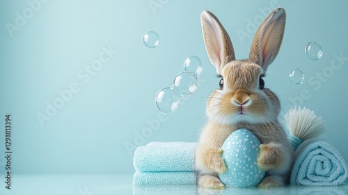 Obraz premium Cute Easter bunny surrounded by towels, bath products, holds Easter egg in a...