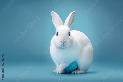 Obraz premium Cute Easter bunny with a blue Easter egg on a blue background. Generative AI