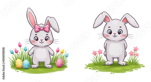 Obraz premium Cute easter bunny with bow and eggs on grass with flowers