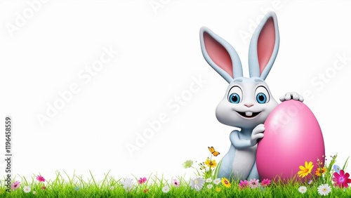 Fototapeta premium Cute easter bunny with egg and spring flowers with copy space