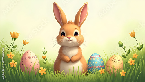 © Passionwith, Fototapeta premium Cute Easter Bunny with Folded Paws Amidst Decorated Eggs (Pink, Yellow, Blue) and Flowers in Green Grass, Soft Spring Background, Festive Illustration for Holiday Themes.