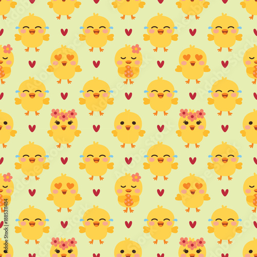 Fototapeta premium Cute Easter chick seamless pattern in flat vector style Adorable baby chicks pattern for Easter spring Cute yellow chick characters seamless vector illustration