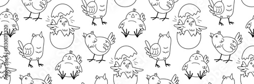 © Anastasiia, Fototapeta premium Cute Easter doodle pattern with funny yellow chick in various poses. Funny character in broken egg. Horizontal spring background. Vector outline illustration.