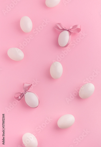 Fototapeta premium Cute Easter flat lay background with white eggs and satin ribbon on pink...
