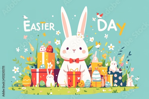 © Mike Joe, Fototapeta premium Cute Easter illustration with large white rabbit, small rabbits, colorful decorated eggs, gifts and flowers under “Easter Day” text. Festive Easter celebration scene.